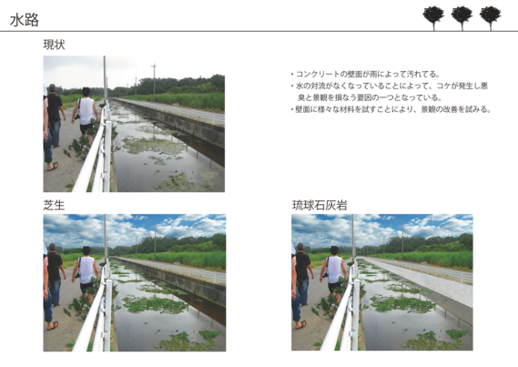 用水路や農村公園などの水路や沿道の植栽の維持管理の行き届いた状態やコンクリート素材を地元で採掘される石・琉球石灰岩に代えるなどのCGシミュレーションを行いました。
